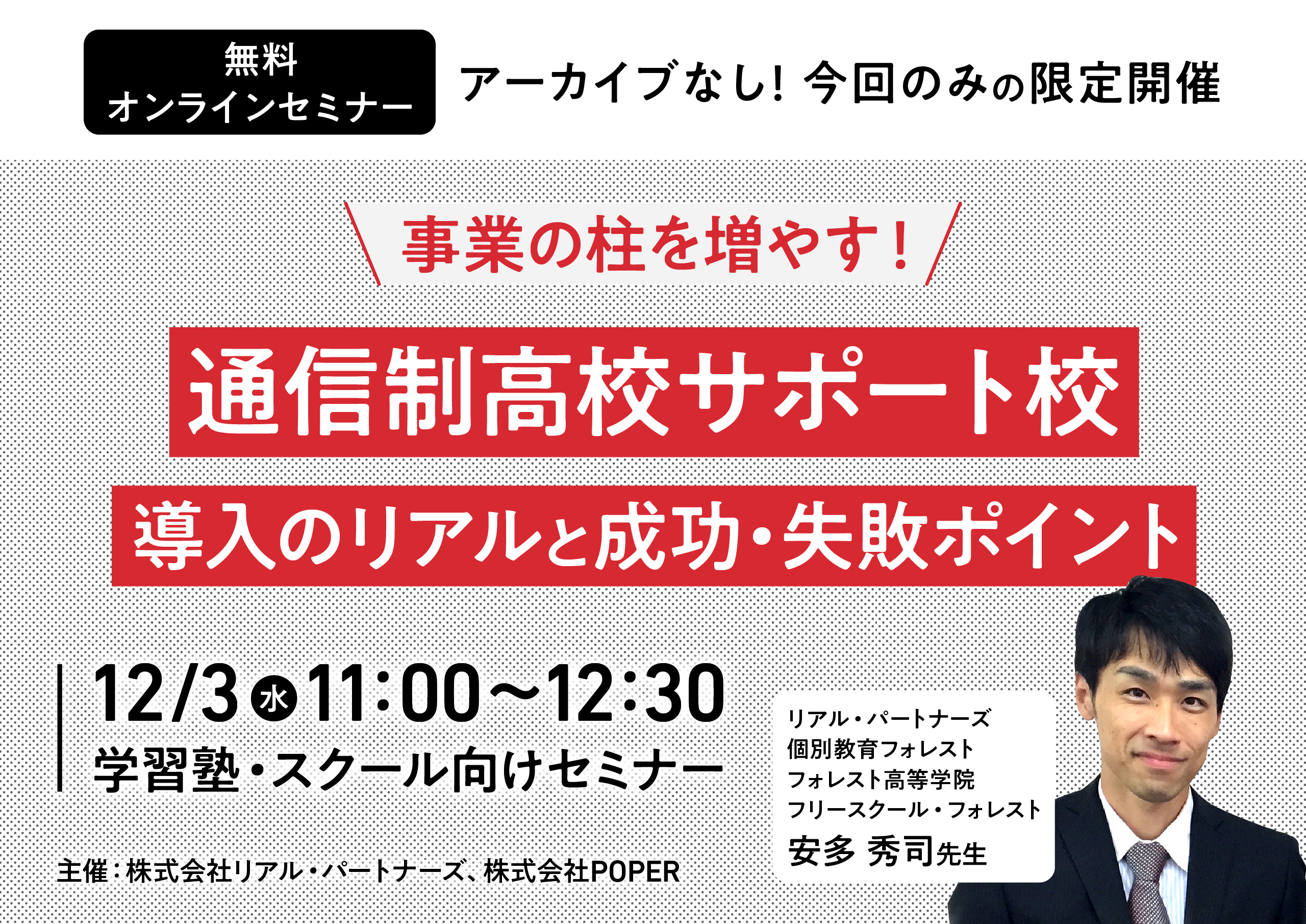 そこで今回のセミナーでは、実際にサポート校の立ち上げから運営までを行っている安多先生をお迎えし、サポート校の基本から導入メリット、成功・失敗のリアルな事例までをわかりやすくお伝えします。